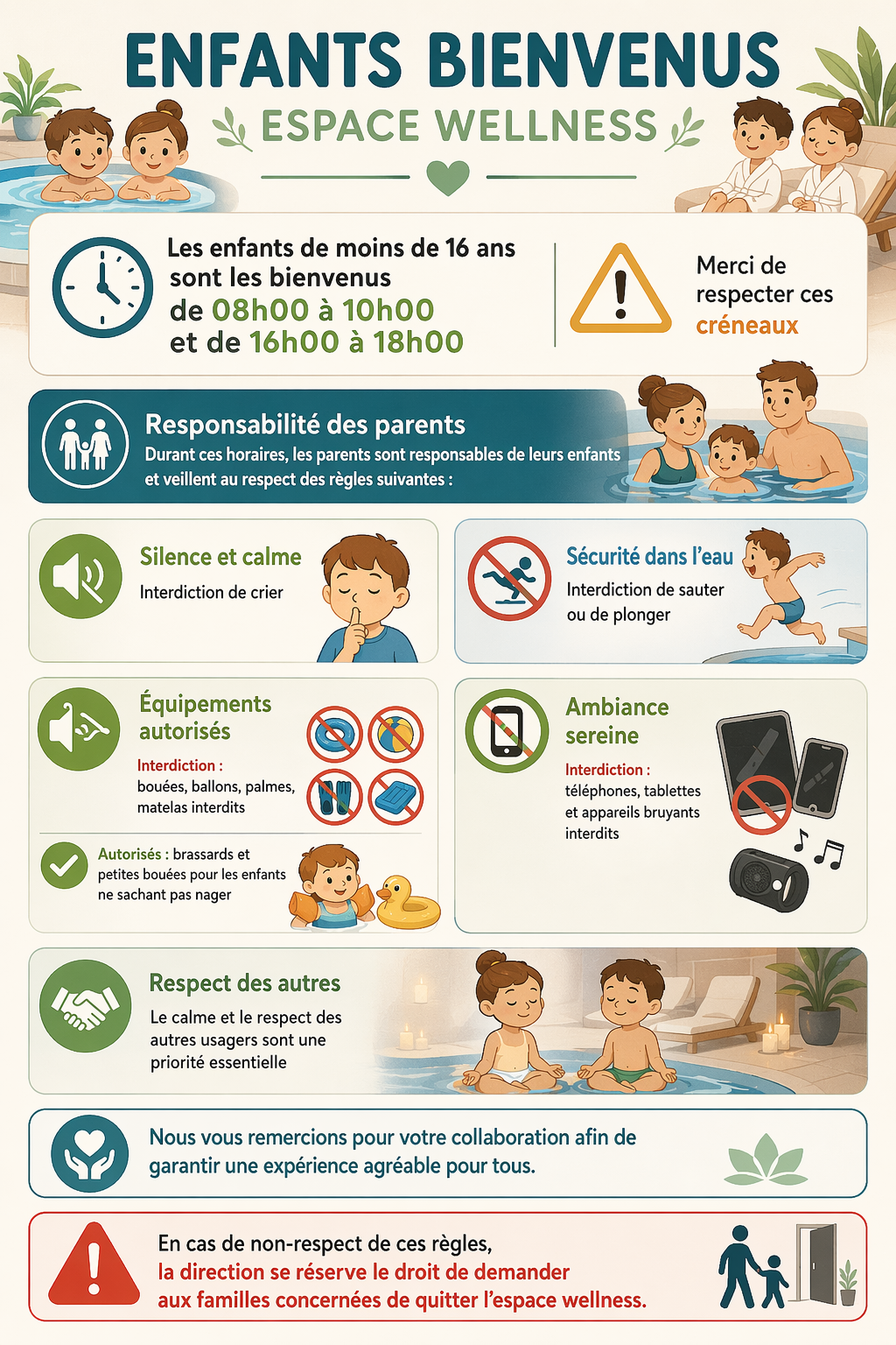 ⚠️ En cas de non-respect de ces règles, la direction se réserve le droit de demander aux familles concernées de quitter l’espace wellness.