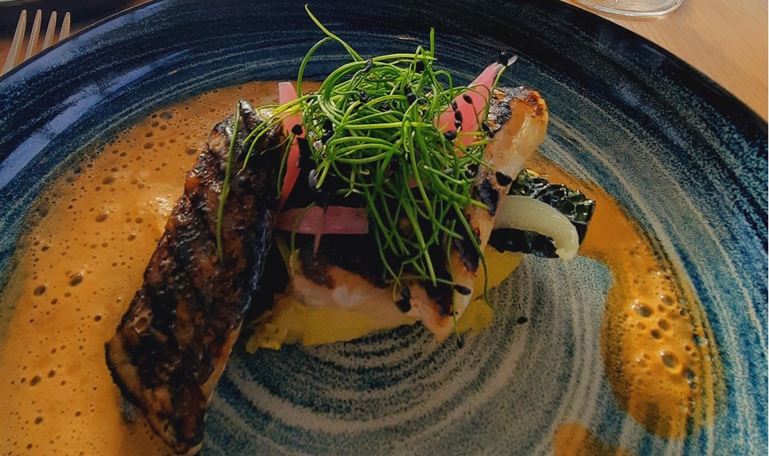 • Gegrilde zwarte zwaardvis, beurre blanc van kool en prei, aardappelpuree met boter en fleur de sel, romige bisque