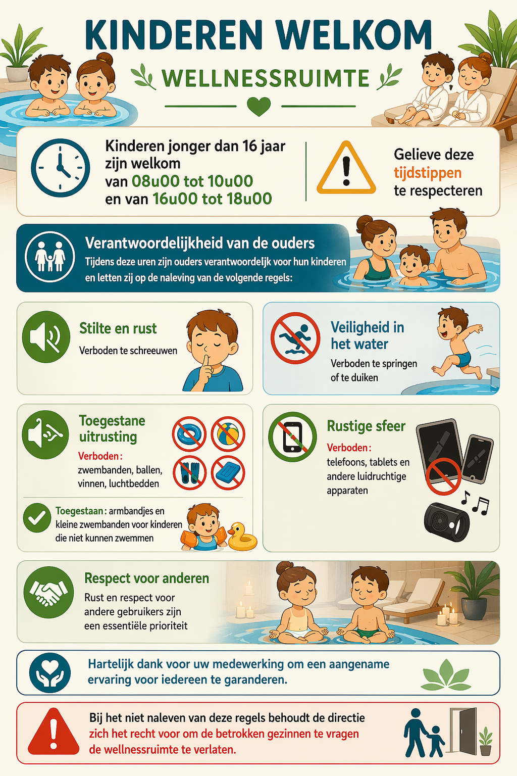 β οΈ Bij niet-naleving van deze regels behoudt de directie zich het recht voor om betrokken families te verzoeken de wellnessruimte te verlaten.
