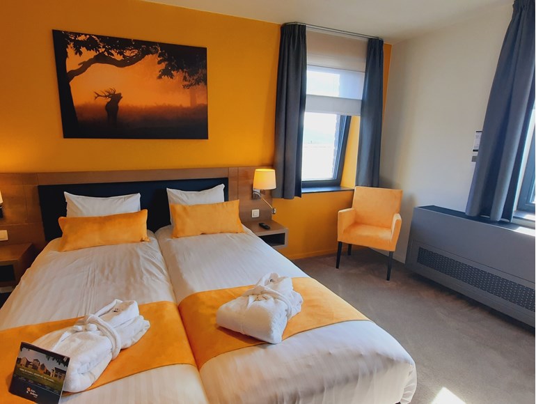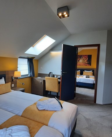 Like the double and twin rooms, the PRM rooms have the same equipment: 32' LED screen television, wardrobe, desk, free safe, telephone, kettle with tea and coffee, WiFi, terry cloth, comfortable bathrobes and hairdryer. For your comfort, slippers are also available at the reception.