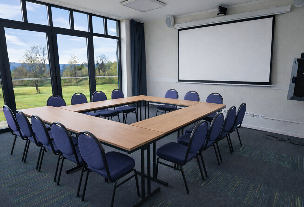 Deze zaal is speciaal ingericht voor videoconferenties en is uitgerust met de nieuwste hightechapparatuur met touch-screenbediening. Een simpele aanraking en de technologie doet de rest.